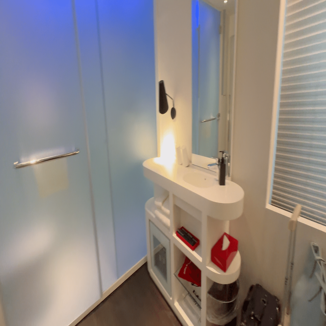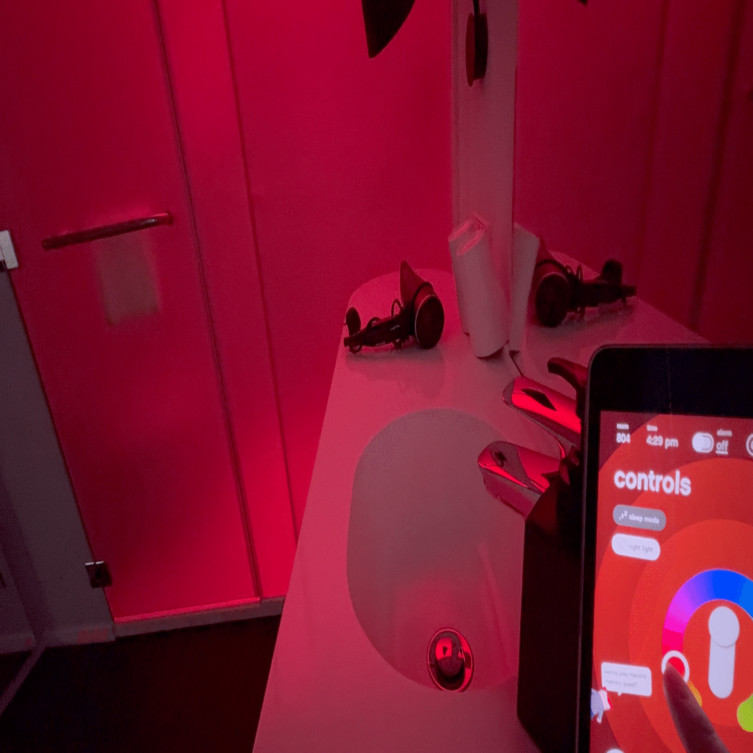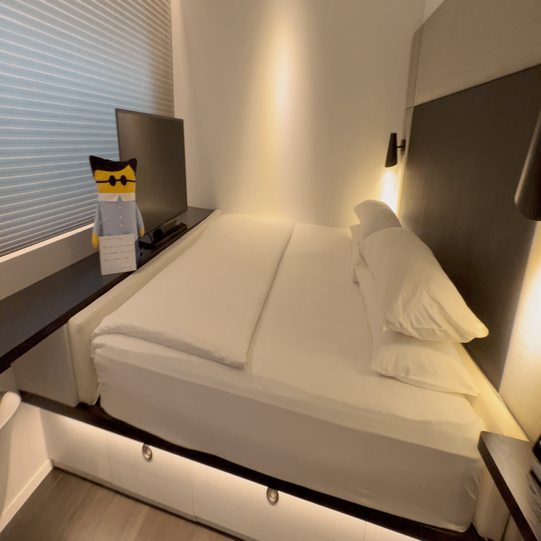 部屋はベッドにバスタブなしのシャワー、オープンクローゼットと、最低限の設備。ただ、キツキツではなく、スペースの余裕があるので、圧迫感はありませんでした。照明もテレビもカーテンの開閉も、すべて備え付けのタブレットで行います。面白かったのは、バスルームの照明の色を変えられること。ピンクで妖しく、ブルーで爽やかにと雰囲気を変えることができます。